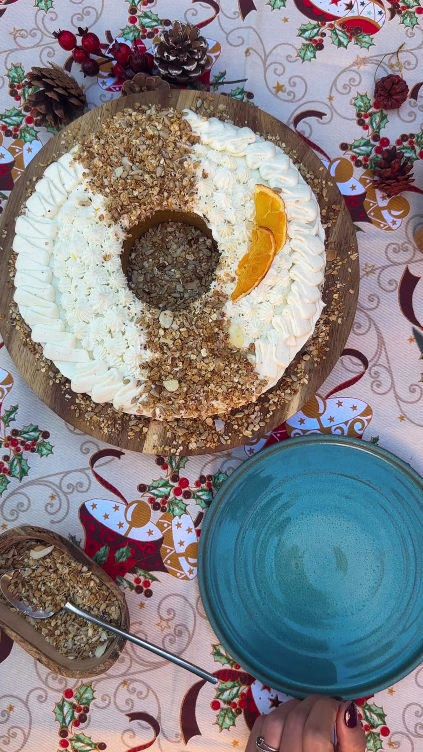 A cobertura cremosa de mascarpone combina com a crocância da granola artesanal de amêndoa, criando um contraste equilibrado entre frescura, cremosidade e textura. É uma sobremesa indulgente no ponto certo, perfeita para partilhar em família ou levar para um brunch de Natal.
