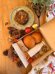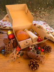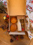 O kit inclui todos os ingredientes necessários para preparar as rabanadas em casa: 2 pães tipo brioche (com ou sem glúten), base líquida para mergulhar o pão, mistura de canela e açúcar de coco, geleia de arroz, granola de nozes e instruções de preparação detalhadas.